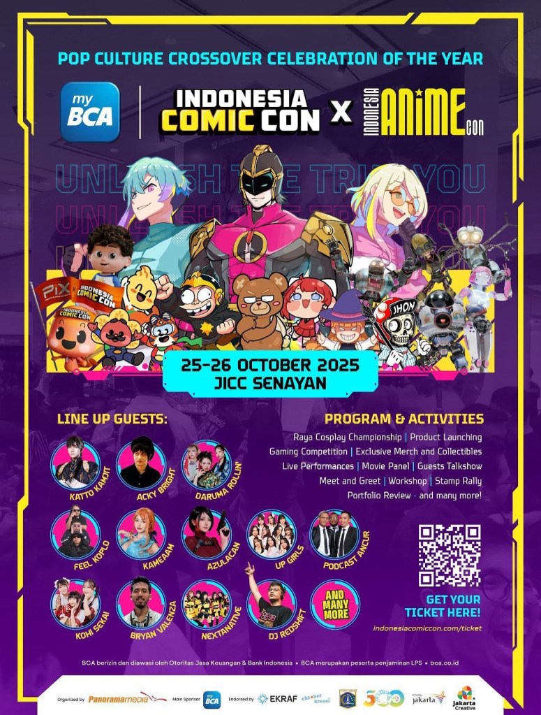 LewatLensa.com – myBCA Indonesia Comic Con (ICC) x Indonesia Anime Con (INACON) 2025 siap menghadirkan “Pop Culture Crossover Celebration of The Year”, yaitu perayaan budaya pop terbesar yang menyatukan dunia komik, anime, film, game, dan musik dalam satu panggung spektakuler. Diselenggarakan oleh Panorama Media pada 25–26 Oktober 2025 di Jakarta International Convention Center (JICC), acara ini didukung penuh oleh PT Bank Central Asia Tbk (BCA) selaku sponsor utama, serta berkolaborasi dengan Kementerian Ekonomi Kreatif Republik Indonesia (Kemenekraf RI), Dinas Pariwisata DKI Jakarta (DISPAR DKI Jakarta), dan Asosiasi Komikus Indonesia (AKSI) sebagai Official Association Partner.