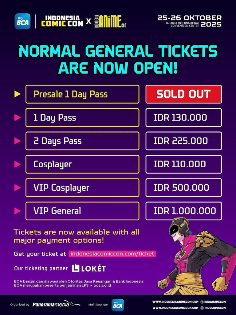 Tiket myBCA Indonesia Comic Con x Indonesia Anime Con 2025 kini sudah tersedia untuk publik dengan harga Rp130.000 (1 Day Pass), Rp225.000 (2 Days Pass), Rp110.000 (Cosplayer Pass), Rp500.000 (VIP Cosplayer), dan Rp1.000.000 (VIP General) untuk dua hari penuh. Penggemar juga bisa menikmati promo eksklusif dari BCA berupa potongan 15% untuk semua kategori tiket normal dengan menggunakan kode promo BCA15, berlaku pada periode 15–24 Oktober 2025. Tiket dapat dibeli melalui Loket.com dan situs resmi http://www.indonesiacomiccon.com/ticket . Jumlah tiket terbatas, pastikan kamu menjadi bagian dari Pop Culture Crossover Celebration of The Year di Jakarta Convention Center, 25–26 Oktober 2025!