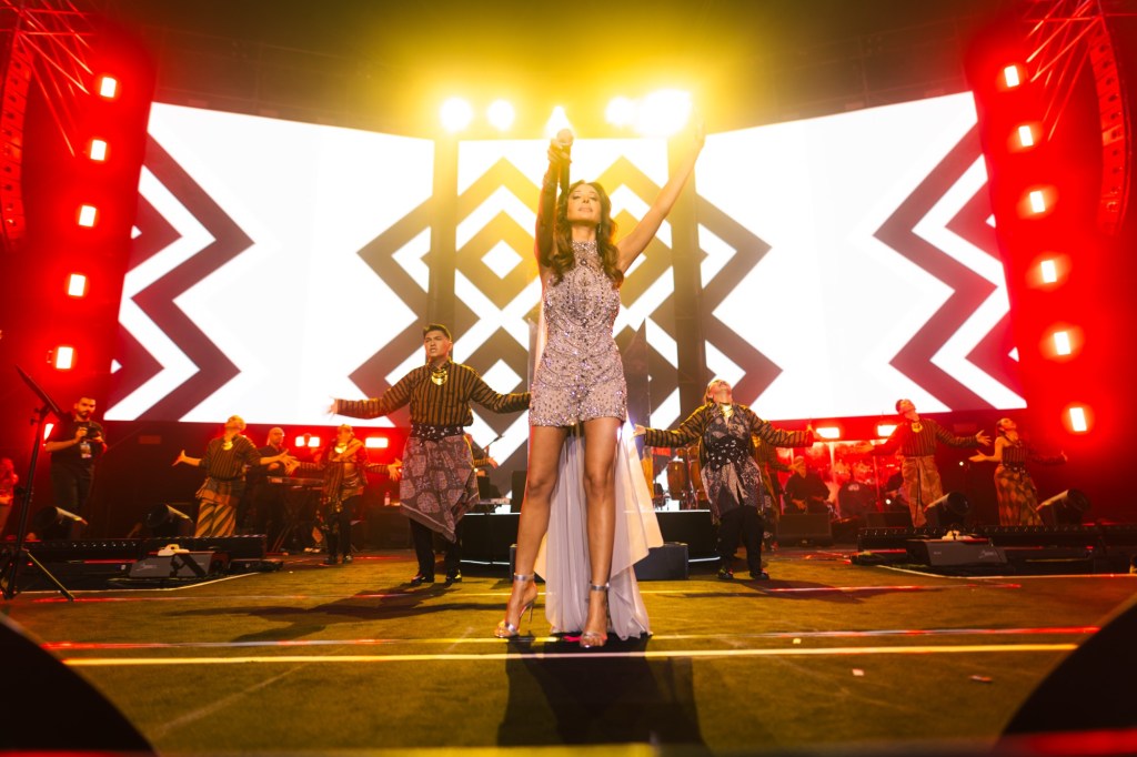 Nancy Ajram membuka penampilannya dengan gebrakan visual spektakuler—perpaduan tata cahaya, efek visual megah, dan aransemen live yang memukau. Lagu-lagu populernya seperti “Inta Eyh”, “Albi Ya Albi”, dan “Aah W Noss”bergema di seluruh penjuru venue, disambut dengan koor ribuan penonton yang ikut bernyanyi dan menari. Setiap nada yang dilantunkan Nancy membangun koneksi emosional dengan para penggemarnya, membuktikan magnet panggung yang dimilikinya sebagai ikon musik Arab modern.