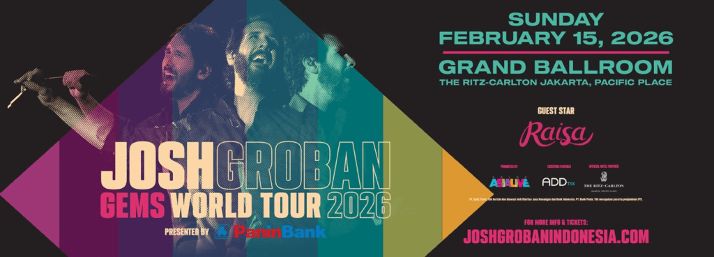 Rangkaian konser spesial ini akan menampilkan produksi lintas karier yang menghadirkan lagu-lagu ikonis dari album Gems, semuanya dibawakan dengan vokal kuat dan ungkapan intim yang menjadi ciri khas penampilan live Josh Groban. Untuk pertunjukan di Jakarta, “Panin Bank Presents JOSH GROBAN – GEMS WORLD TOUR 2026” yang dipromotori oleh Color Asia Live partnership dengan The Ritz-Carlton Jakarta, Pacific Place akan digelar pada: